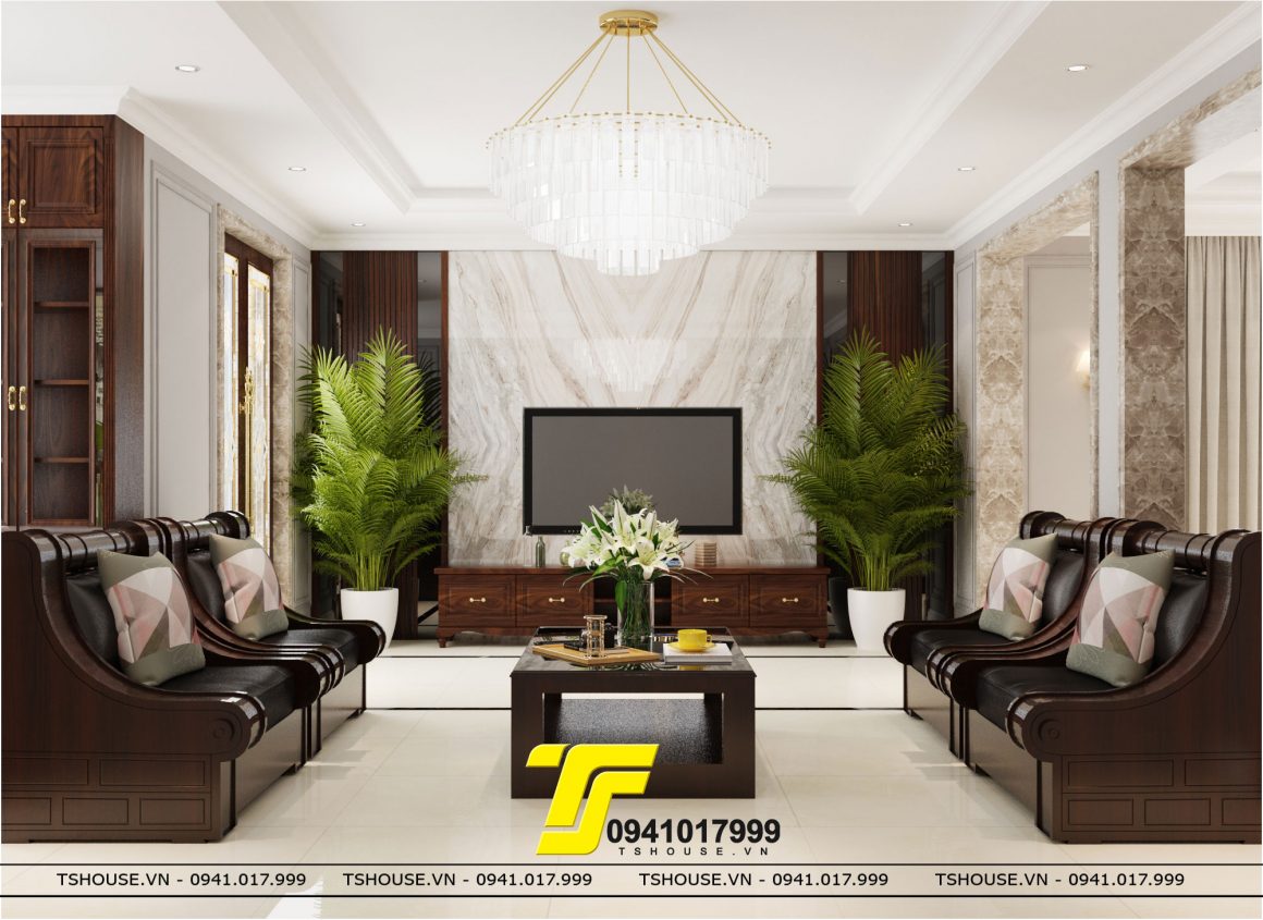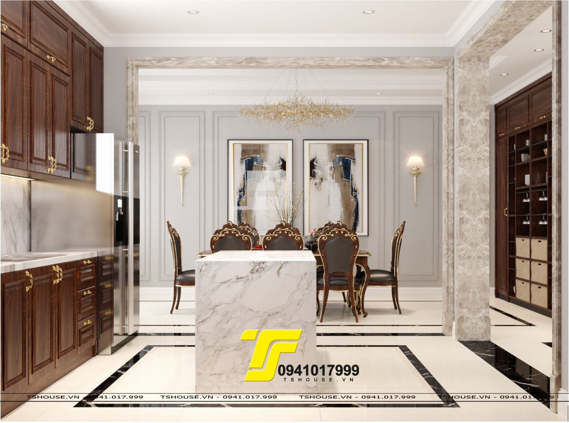Thiết Kế Nội Thất Biệt Thự Vinhomes Riverside The Harmony , Căn biệt thự được thiết kế với ngoại thất phong cách Tân cổ điển , Về nội thất được thiết kế khá nhẹ nhàng với tone màu trang nhã , Phần phòng khách được thiết kế với chủ đạo gỗ tự nhiên , các mảng tường được ốp phào chỉ tinh tế , mảng tường kệ tivi được ốp đá sang trọng , Bộ bàn ghế gỗ và bàn trà rất tinh tế và thể hiện được rõ nét cá tính của chủ nhân căn hộ , phần sảnh thang được để thoáng và treo bộ đèn chùm tạo điểm nhấn , phần bếp được thiết kế kịch trần và cùng tone với tổng thể của phòng khách , quầy bar được làm bằng đá Vicostone rất sang trọng, Bộ bàn ăn bằng gỗ tự nhiên bọc da kết hợp với 1 chút chi tiết mạ vàng , tạo điểm nhấn cho không gian phòng ăn . Hệ tủ rượu cao kịch trần và được thiết kế với sự đặc rỗng để vừa có thể có những không gian trưng được những chai rượu quý hay những món đồ decor yêu thích .