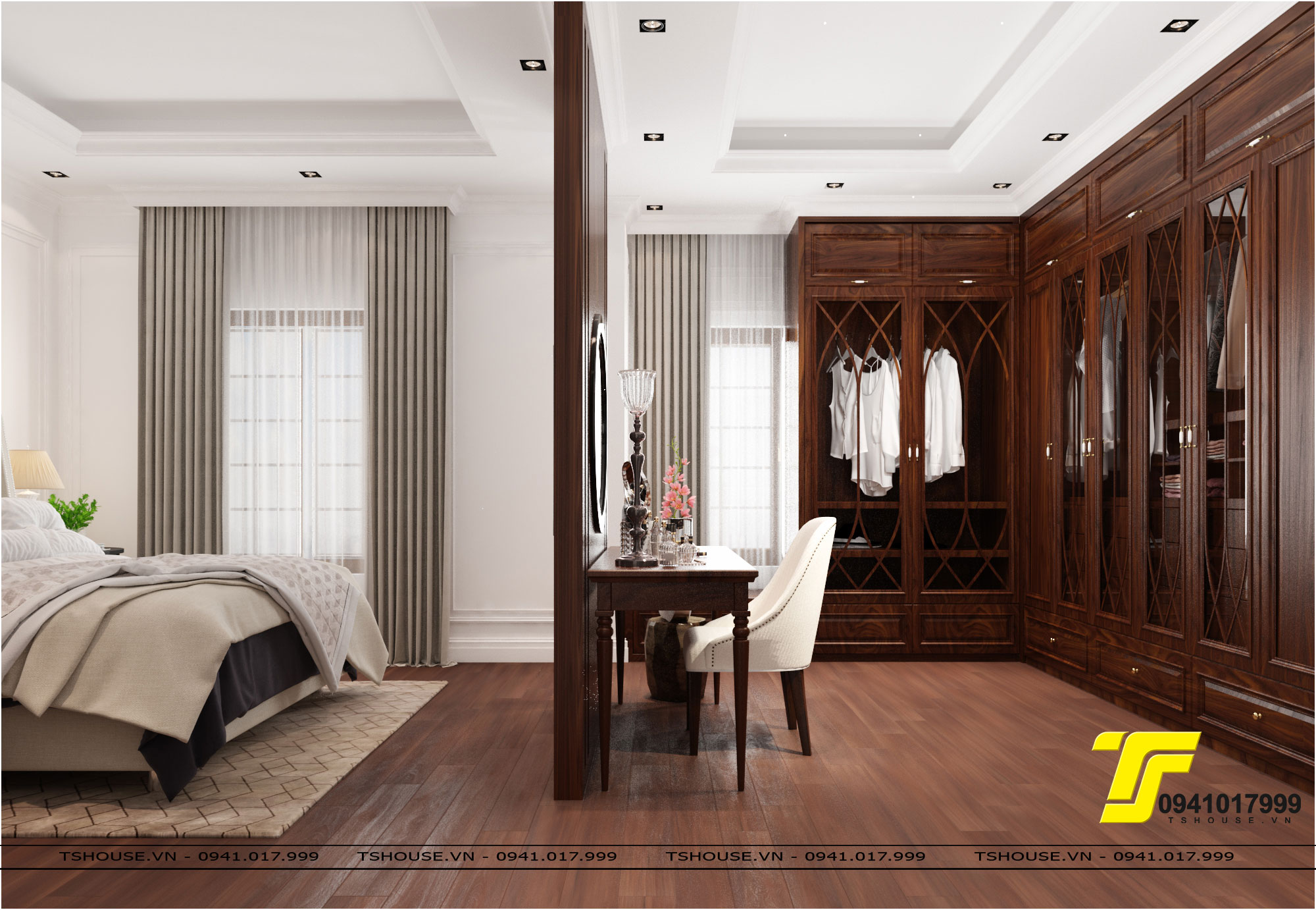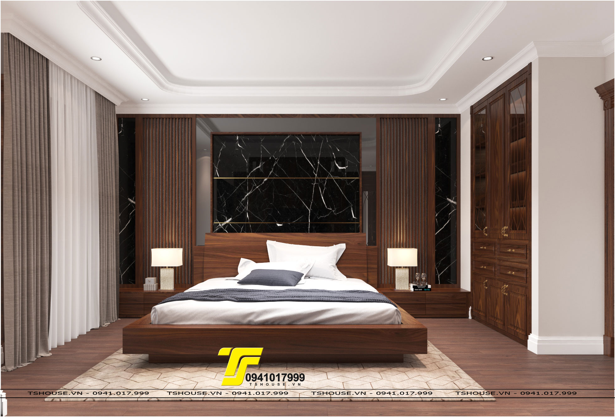 Phòng ngủ master được thiết kế với toàn bộ Gỗ óc chó , 1 không gian vô cùng ấm cúng và sang trọng , mảng ốp đầu giường là sự kết hợp hài hòa giữa những vật liệu , không giant hay đồ với hệ tủ quần áo cao sát trần và đủ rộng .