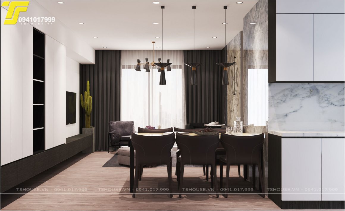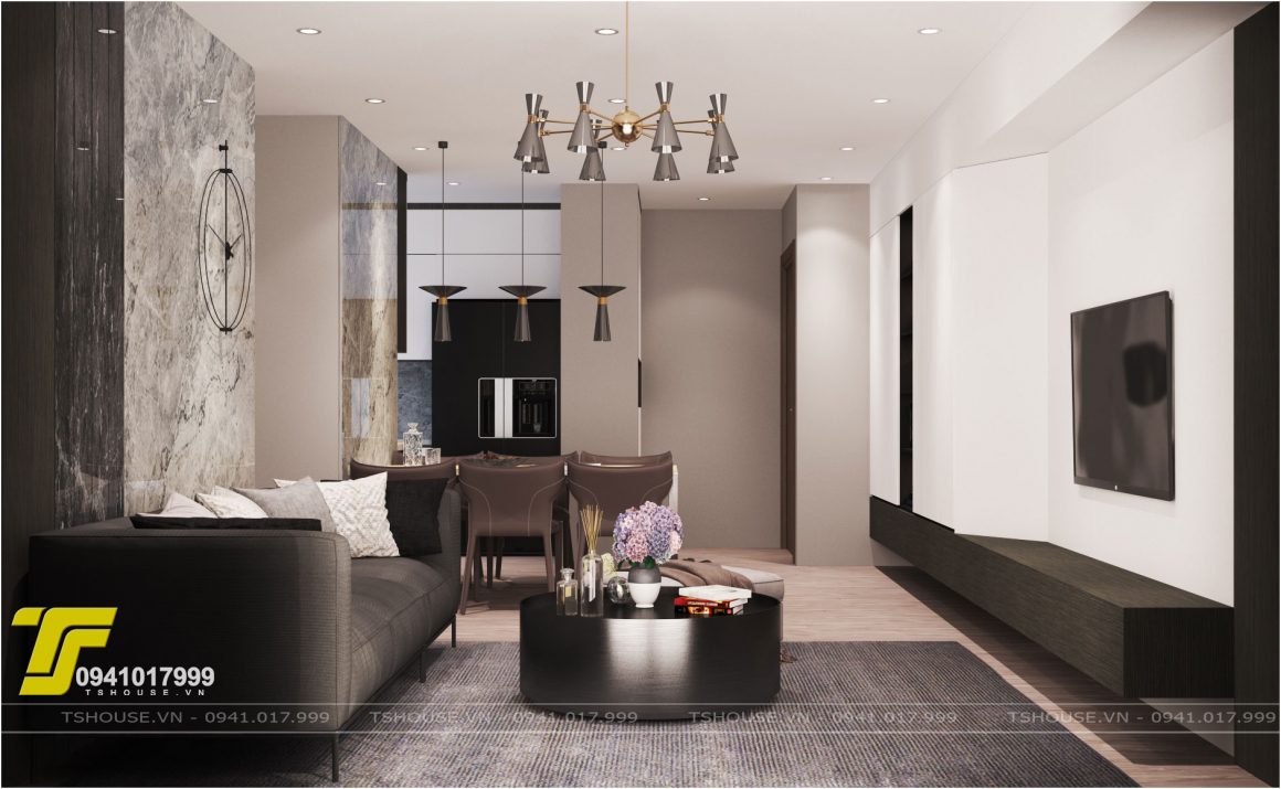 Thiết kế nội thất căn 3 ngủ tòa C6 chung cư D’capitale được thiết kế theo phong cách đương đại , tối giản mọi chi tiết về đường nét và chi tiết trong nội thất nhưng đầy đủ tiện ích về công năng , tone chủ đạo của căn hộ được thiết kế màu trầm , tối nhưng có tính tương phản cao , Phong cách thiết kế nội thất hiện đại đang rất được yêu thích và ưa chuộng cho những không gian chung cư.So với các phong cách thiết kế nội thất khác như phong cách nội thất luxury ,phong cách thiết kế nội thất cổ điển ,nội thất tân cổ điển ,Scandinavia…thì phong cách thiết kế nội thất hiện đại chiếm rất nhiều ưu thế.Nhìn chung các khách hàng đều lựa chọn phong cách này bởi vì nó mang lại những tiện ích nhất định cho khách hàng.Thứ nhất vì nó mang lại những giá thành hợp lý,phù hợp với đa số mức thu nhập hiện nay của mọi người.Thứ hai là nó mang lại những tiện ích nhất định,phù hợp với người châu Á.Vốn dĩ chúng ta đều muốn mọi thứ được gọn gàng,ngăn nắp trật tự,vì thế cho nên nội thất hiện đại hiểu và chúng dáp ứng được các nhu cầu đó của mọi người.Căn hộ được thiết kế phòng khách rất đơn giản và nhẹ nhàng,có sự kết hợp giữa các mảng tường gỗ và gương bóng tạo nên sự sang trọng.Ghế sofa được thiết kế màu ghi đậm làm điểm nhấn cho căn phòng.Phía bên khu vực bần ưn có thiết kế mảng gương tạo nên sự ấn tượng và giúp căn phòng có chiều sâu hơn.