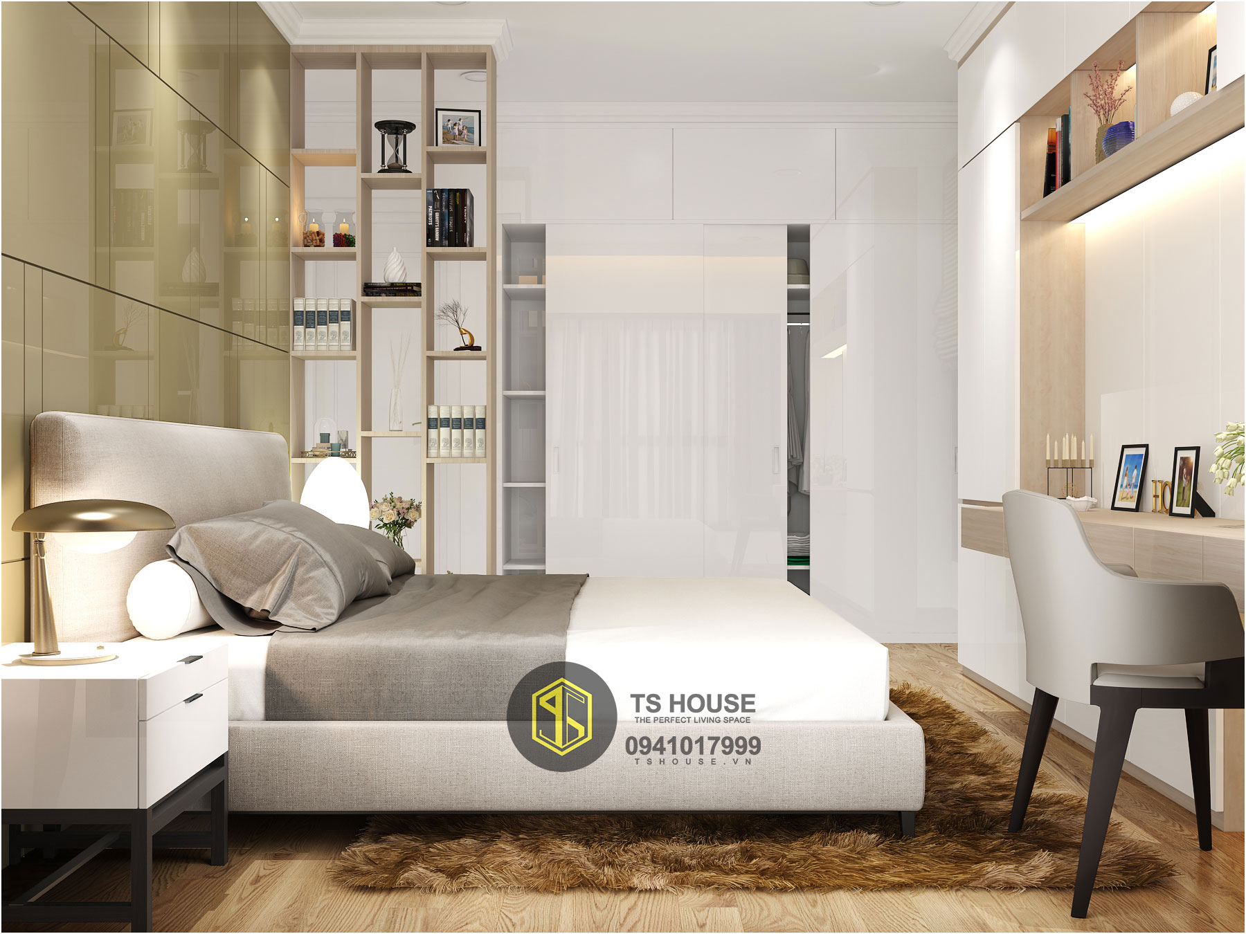 Kế đến là thiết kế phòng ngủ Master.Phòng ngủ Master được thiết kế nhẹ nhàng tinh tế.Mảng đầu giường sử dụng vách ốp bằng gỗ phủ Acrylic .Điều đó làm cho không gian trở nên tinh tế hơn,không quá nổi bật nhưng cũng không bị nhạt nhoà,với thiết kế khá gọn gàng sạch sẽ,ngăn nắp màu sắc hài hoà mang đến sự riêng tư và kín đáo cho phòng ngủ. Phía kệ ti vi đối diện với giường ngủ được làm 1 hệ tủ để tận dụng theo nhu cầu sử dụng của chủ nhân căn phòng.Vừa đảm bảo công năng sử dụng mà vẫn không làm mất đi tinh thẩm mỹ cũng như sự hài hoà trong căn phòng.Phòng ngủ là nơi cần sự yên tĩnh và nhẹ nhàng,chắc hẳn sau 1 ngày làm việc vất vả mệt mỏi sẽ không ai trong chúng ta muốn bước vào một căn phòng chật chội và đầy màu sắc sặc sỡ.vì vậy một thiết kế vừa hài hoà về màu sắc và hinh khối sẽ đem lại một không gian thoải mái trong căn phòng,giúp xua tan mệt mỏi sau 1 ngày làm việc áp lực. 1 phòng ngủ con được bày trí với hệ kệ sách trang trí, không gian học tập sinh động , phía diện đầu giường sử dụng tranh để tạo điểm nhấn cá tính cho cậu chủ nhỏ . Phòng làm việc được tách biệt với hệ tủ sách rất lớn đủ đáp ứng nhu cầu làm việc của chủ căn hộ…. Thiết kế nội thất tòa a1 căn 15 gardenia là một trong những thiết kế mang hơi hướng hiện đại và đề cao sự đơn giản,tối ưu hoá trong không gian,không cầu kì nhưng lại sang trọng từ các thiết kế đơn giản nhất,gọn gàng và đầy đủ tiện nghi không kém phần tinh tế.