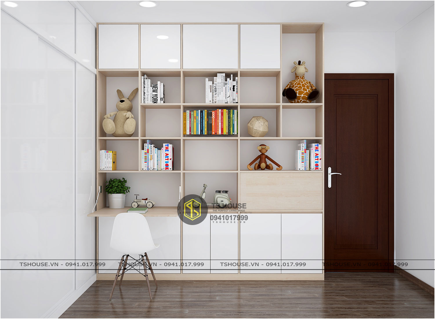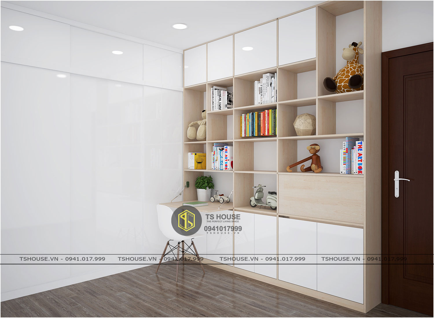 Với sự kết hợp tủ kệ và chia hộc tạo cảm giác vui mắt không bị nhàm chán trong căn phòng.Từng chi tiết bố trí trong căn phòng đều mang lại một không gian hiện đại cho người sử dụng.